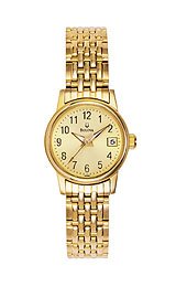 Classically styled for the lady who doesn't bow to trends, this fully gold-tone Bulova stainless steel women's dress watch will be a treasured timepiece for years to come. It features a mid-sized, round case that's topped with a rounded, highly polished bezel that frames the champagne dial. It also offers a full Arabic numeral display, small minute indexes, gold-outlined luminous dagger-shaped hands, and a date display at 3 o'clock. The stainless steel bracelet is composed of thin, rectangular links and it offers an equally bright, polished finish. This precise quartz timepiece also features a scratch-resistant mineral crystal and water resistance to 30 meters (99 feet).